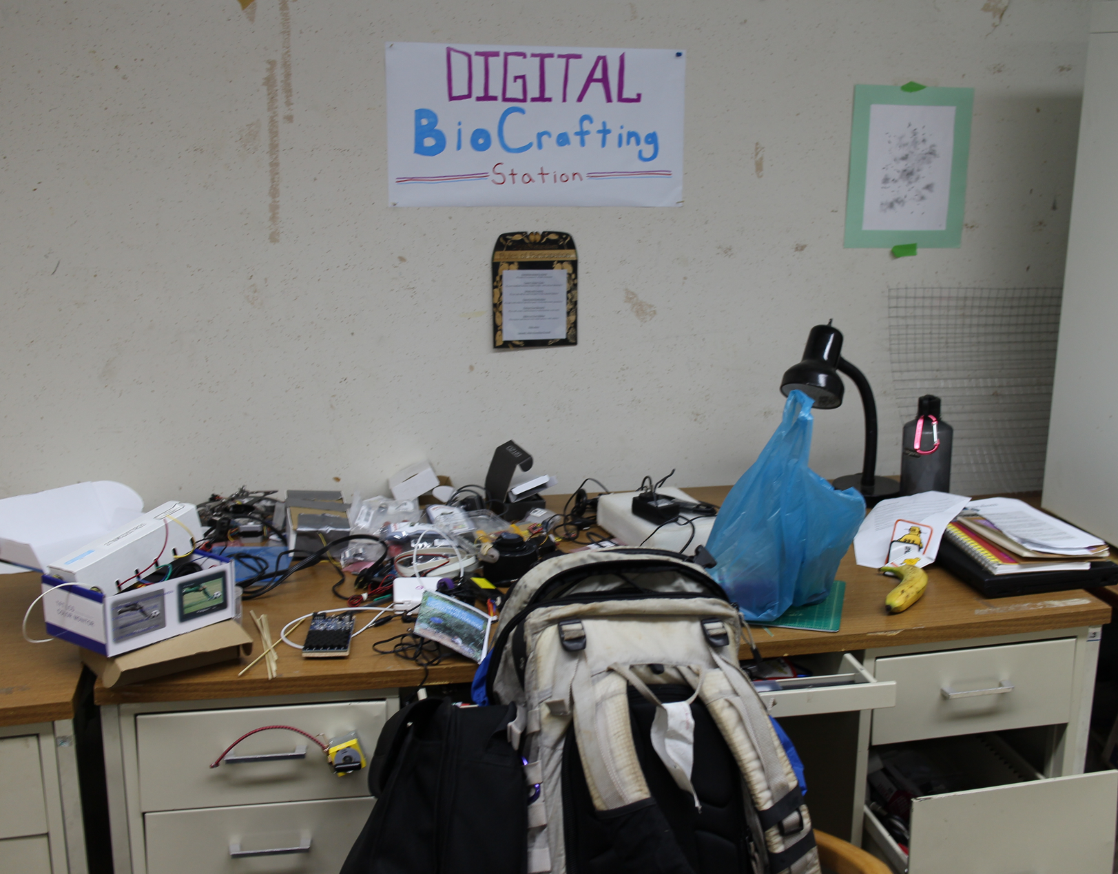 I instructed peter to take two techno-artifacts from our messy biocrafting station which we were setting up (it has a sign now!). We would use these to enact some sort of performance prototyping a behavioral tool. As with any performance, I find myself always internally cynical. I default to being my own devil’s advocate despite the purported performative basis of my research. Before hand, i always have a nagging feeling of, “this is stupid, we are going to dance around and pretend, and nothing will be accomplished because we know what’s going to happen.”