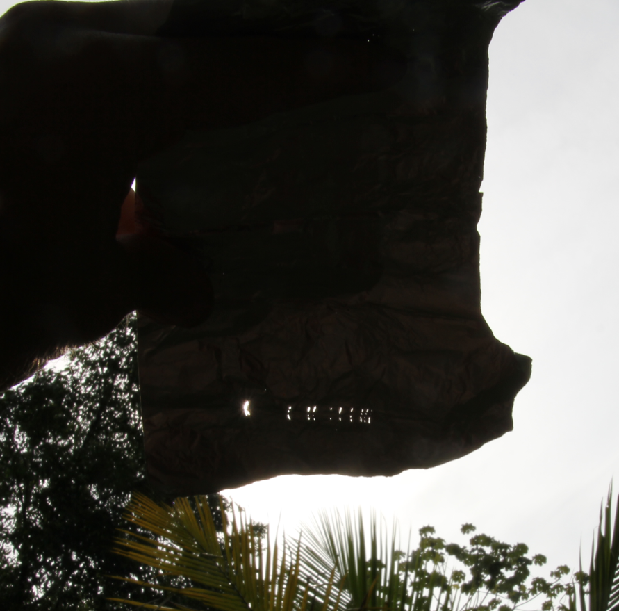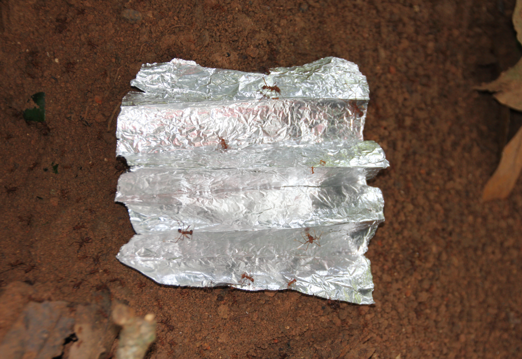 This morning I tagged along with Chris and Victoria on a bullet ant nest hunt which proved to be apocryphal. Instead we worked on ways to test aggression in leaf cutter ants. Having trouble at first, because the ants weren’t biting through the flat foil, but then we though to fold the foil in a bit of a fan shape, and they were able to grab a purchase on it then with their mandibles. This made neat aesthetically pleasing holes that were revealed when held to the sun.