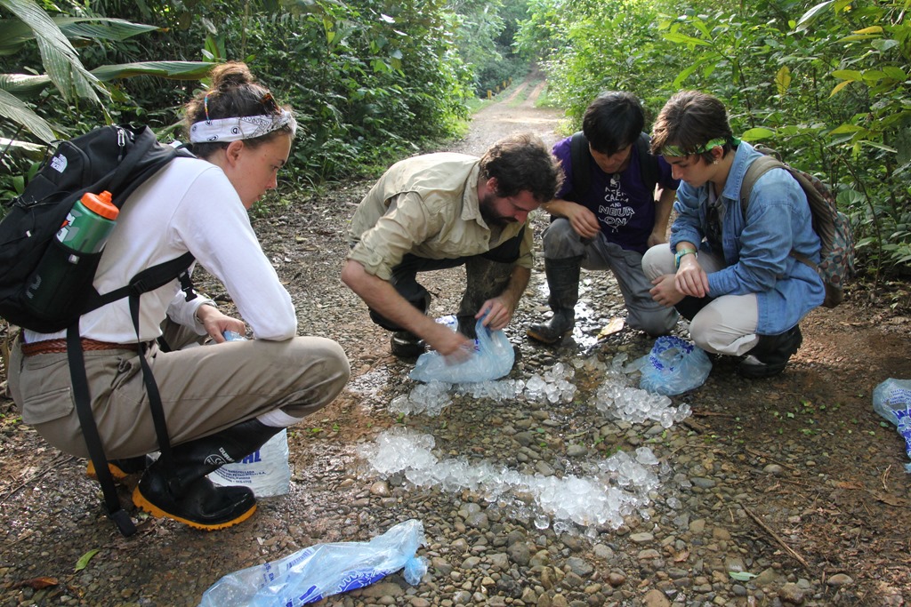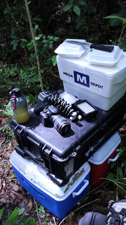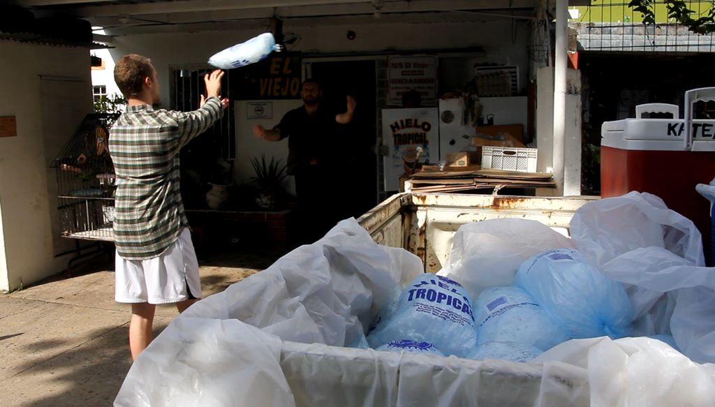 Get to La Tienda. Guy seems a little weirded out that we actually came for the “mucho mucho mucho hielo” I requested earlier in the week. 60 bags total. Loaded 40 into coolers and my newly emptied out pelican cases. Wrapped the remaining bags in a white tarp (that Peter used for harvesting Aztecas from Cecropias). KC saw us loading ice and decided she was game to join the crew.