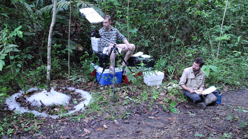 Peter and I have hiked out to his secondary field site down old Gamboa Road. Unlike pipeline, this old road is barricaded, so we cannot drive our equipment down to his trees, and instead have to take his cameras, tripods, and full sized ladder through the jungle and up a creek. We set up the first of the days experiments around 8am. Howler monkeys lazily gaze down upon us. Probably resting after all the sunrise screaming. My second official day shadowing him, and he has already worked many of the kinks out of his process. All the cameras are charged, no tripod switching, timings are all down pat with additional buffers for recording ant movements.
