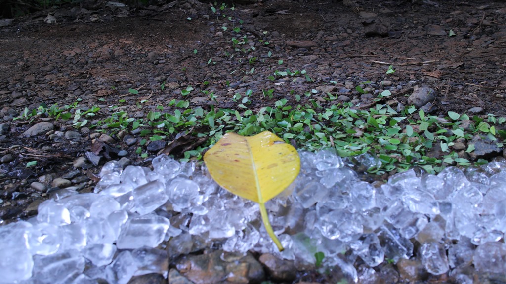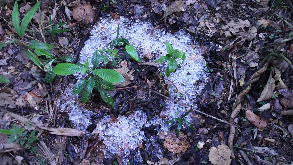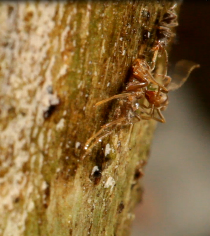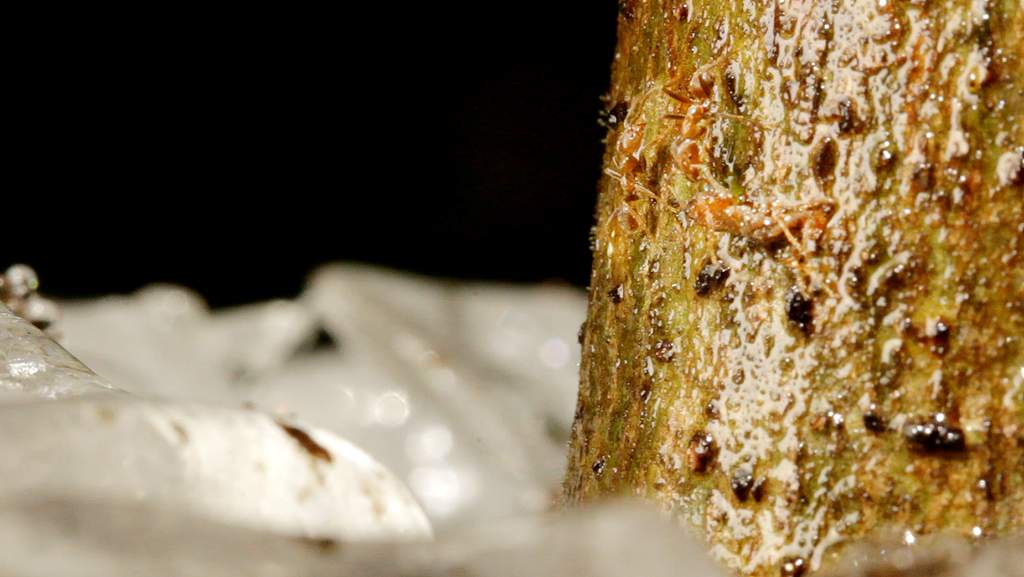 Drive back to town, setting up installations along the way. This time around a foraging leaf-cutter trail. Drop off KC, cannot find dolly. Maybe it bounced out of the truck? Drive back to dallas who has been performing a manual time-lapse for us and guarding the tree from the rain. No sign of camera dolly. Bring him lunch. Eat and discuss, and suddenly he has a batmeeting he needs to go to. Peter leaves me at the cecropia ice installation, whose inhabitants are still attacking full force (for over 3 hours by now).Time passes trying to get aesthetically pleasing macro shots of Azteca performing unseen behavior where they shake or pull their frozen compatriots from the icy depths. They are able to revive many. The ice is taking much longer to melt than thought.