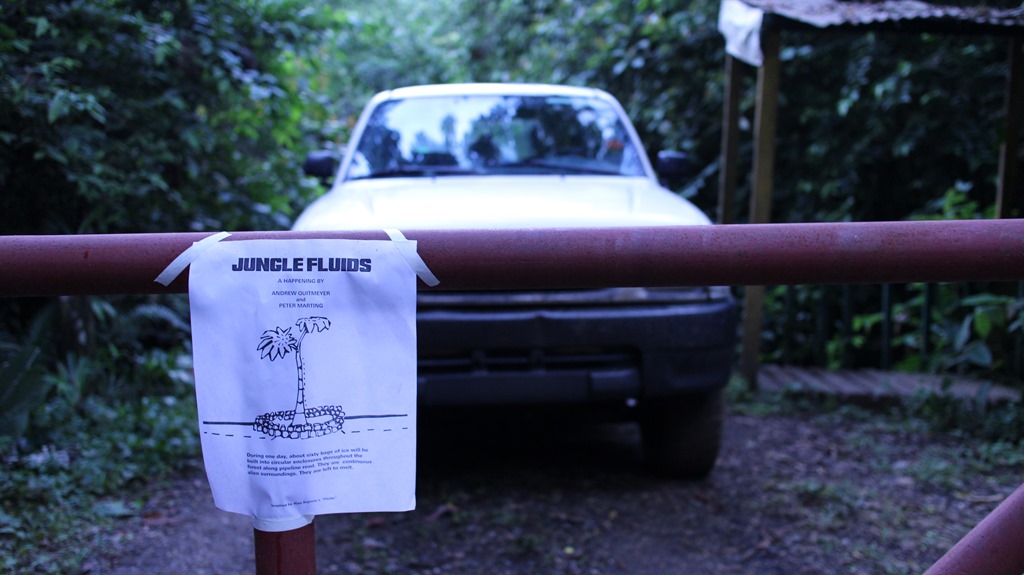 To give my digital naturalists some practice at alternative forms of performance, I am having them recreate famous performance works in the jungle with their creatures. The first one to go was Peter, who from a list of famous works of performance art chose to reenact Alan Kaprow’s piece, “Fluids.” In “Fluids,” Kaprow built large structures of ice around LA and left them to melt. We were going to try out the same thing in the Neotropical rainforest. A place where ice scultpure art is not only uncommon, it actually introduces a whole new state of matter to the animals that typically only live in the thick sweltering heat of the jungle.
