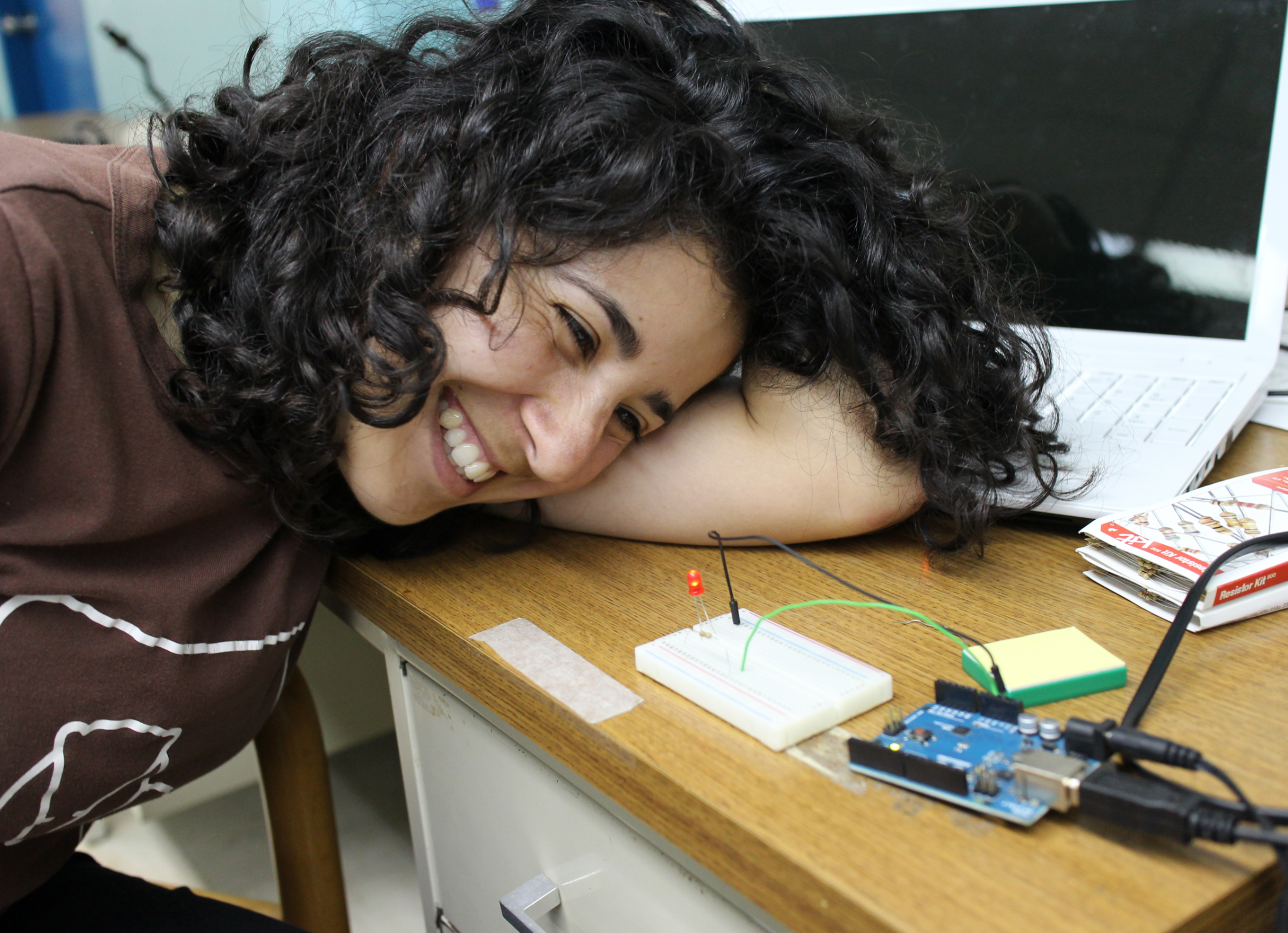 Over the next two days she kept independently going through her code to figure out all the parts, and at the beginining of the workshop on monday, triumphantly stormed in, showed off her contraption to everyone around, and then sat down with a ring of people to teach them all how to do the same! It was impressive. I’ve never seen this sort of enthusiasm for coding and electronics from any engineer.