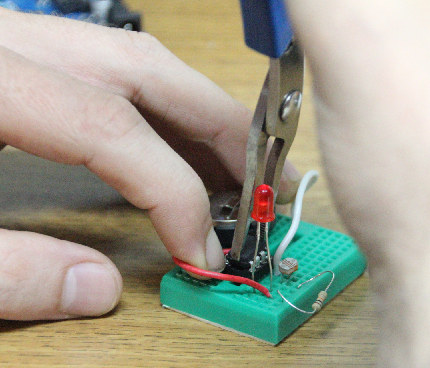 My first step was to build circuit that make LED turn on. Then we learn how to use arduino and so to control the electricity and make the LED blinking with computer code. Then we programmed servo to move on its own. Finally I looked up how to make a moisture sensor circuit in Google and I hooked up the sensor to the arduino and the servo and programmed so the sensor make the servo move differently.