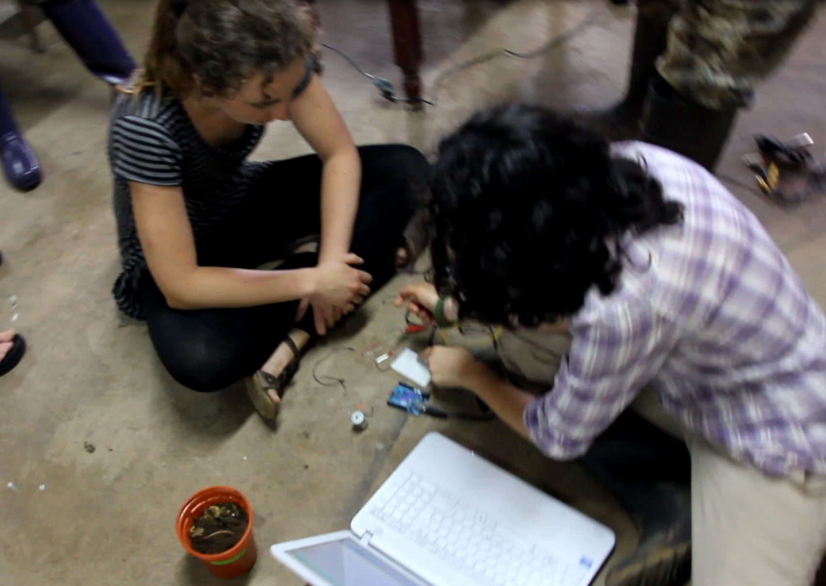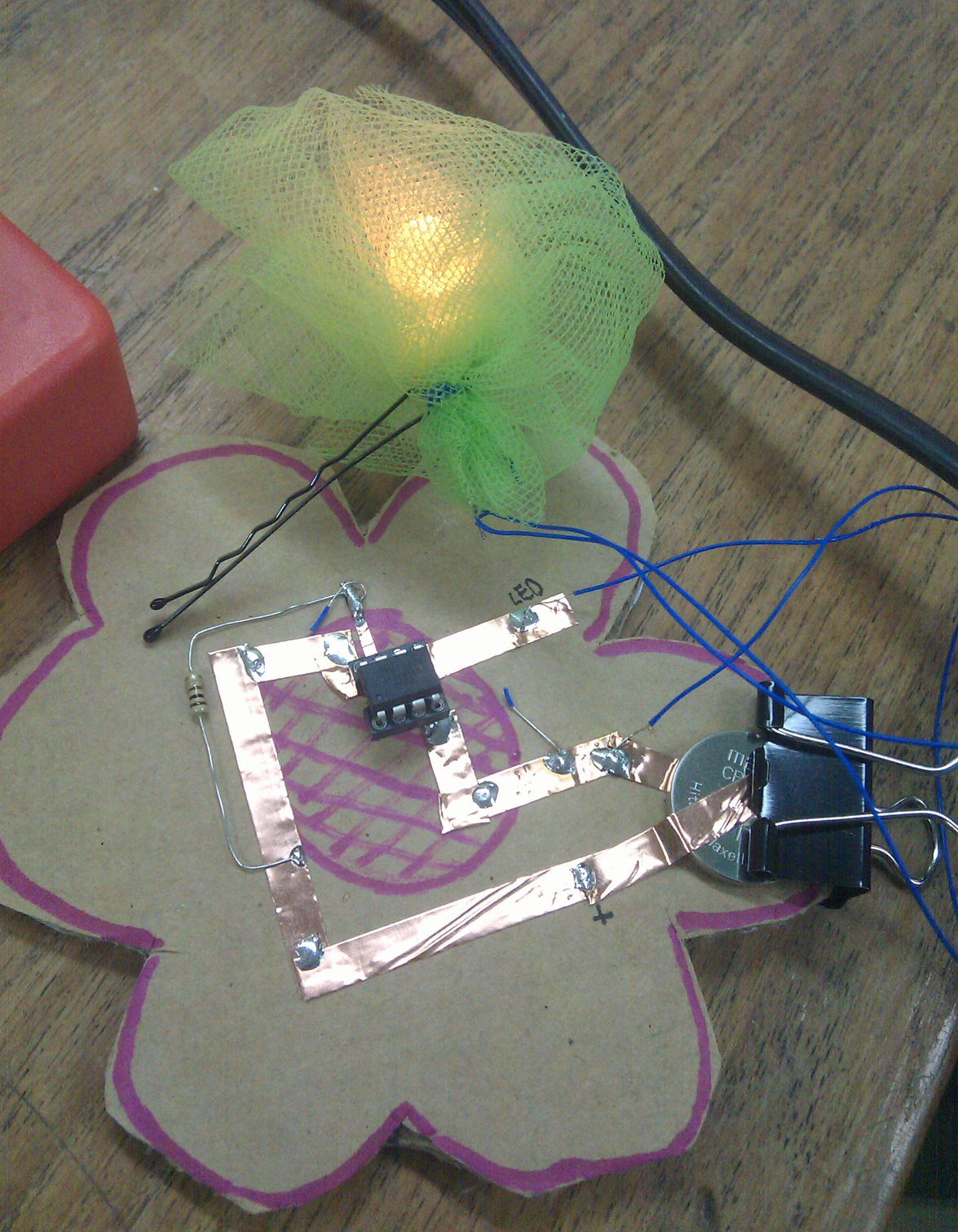 Over the weekend worked with Toni and Peter. Peter had arduino experience from my work with him last summer, so I started him on more advanced circuit making and the fickle problems of ATTinies. Toni on the other hand had never touched computer code in her life, and knew nothing about electronics. So i started her off with simple circuit building and LED blinking examples, but she was so delighted, and kept absorbing so much, within an hour we were onto building full moisture sensing to servo controlling mechanisms.