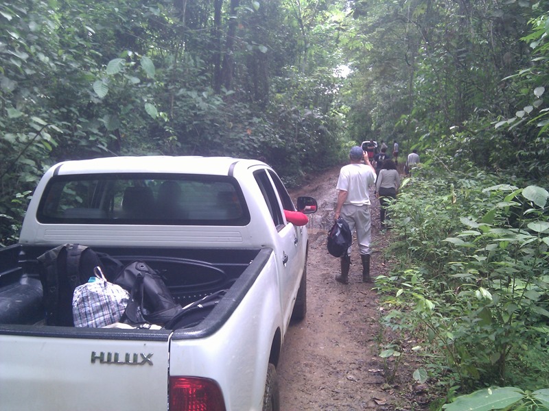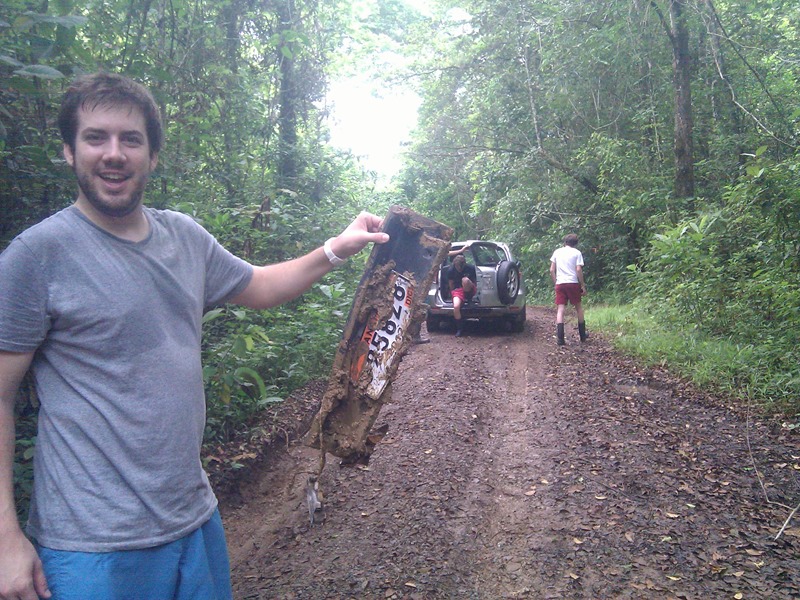 After an hour, Peter pulls up in truck. He saw my weird, large mammalian body sprawled in the road and thought I was a tapir. He now has Marc Seid with him and three interns. They are happy to report that they found my dolly! They pull out a brown metally mess. After having driven over it 4 times ourselves, and with at least 3 other run overs by other trucks, it had peeked itself out of the deepest puddle on pipeline. Nothing was bent, only one simple screw had come off, and after I rinsed off the mud and re-lubed it, it worked good as new!