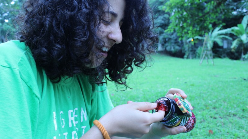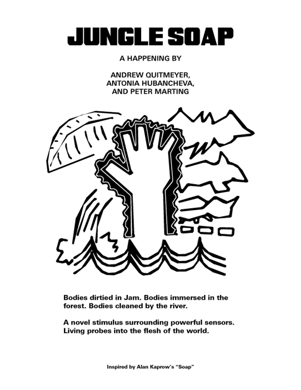 For my second “Digital Naturalist” collaborator, Toni, we met up late one night to discuss which famous work of performance art she wanted to reenact in the jungle. We discussed Joe Beuys, Yoko Ono, (she brought up Abramovich’s piece with the gun), and more of Kaprow’s happenings. She really enjoyed reading about the piece for “Raining” where various objects in the world were painted and then waited on for the rain to wash away (pictures of boats along gutters, trunks of trees painted red, people’s naked bodies). She eventually chose an adapted, and condensed version of Kaprow’s “Soap” to perform where we would cover our bodies in Jam and wash them in the river.
