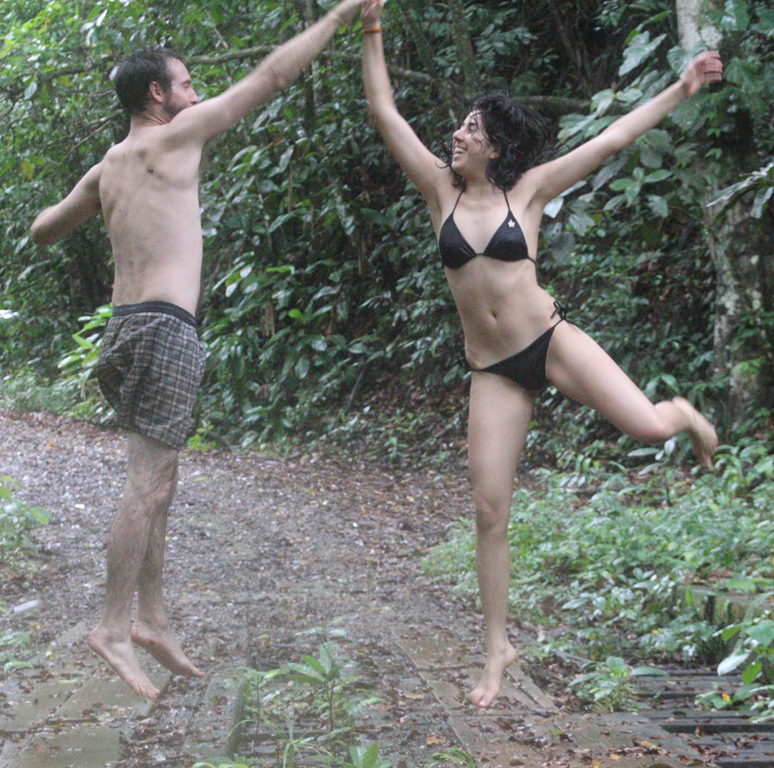 It rained a ton, which made the normal way of walking up to the waterfall (along the edge of the river), quite impossible (especially if we wanted to keep our jelly on). The rain also kept the insects at a minimum which we had anticipated being one of the main experiences of our journey. Instead one of the main things we noticed were about how a body, unencumbered by backpacks and clothes, can move through a jungle. Peter noted that he was able to sneak up on a deer due to his ability to move ultra-silently. The jelly served as a way to highlight all our intereactions and brushings against different insects, dirt and vegetation.