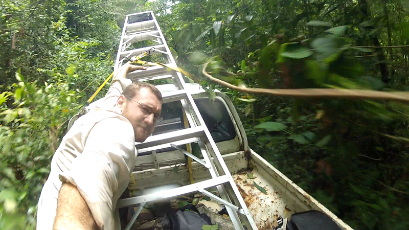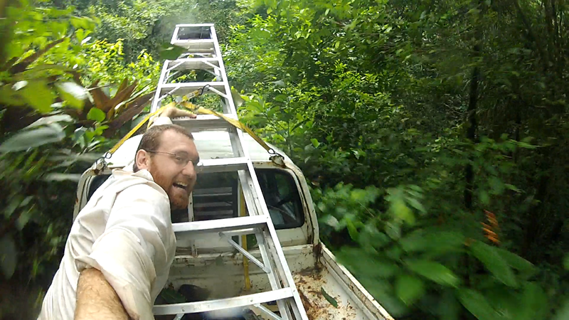 Peter’s jungle ladder has been capturing my imagination more and more. So much so, that I even wrote a poem about it (adopted from WC Williams’s “The Red Wheelbarrow”). It is a simple household tool, but completely necessary for Peter to gain closer experiences to life with the Azteca. The trees and ants are trying their best to keep others from experiencing their world, and the ladder defeats them. The way we carry it in his truck makes it collect all sorts of interesting debris as we drive through the forest, but because it is in the back, this process remains mostly hidden to us. There’s not much logically missing from this process when we think about it abstractly, a ladder sticks up and waps all the branches and leaves that hang down. But it is such a dynamic system, I have been wanting to feel it more deeply and experience it from within. It also didn’t hurt that the truck was full on the inside anyway. So I set to surf the truck down pipeline and put myself directly in the ladder. Something stung me on the eye, I got slapped around something fierce, and I got bit by dozens of different creatures. It gave me something I am not sure quite yet how to express.